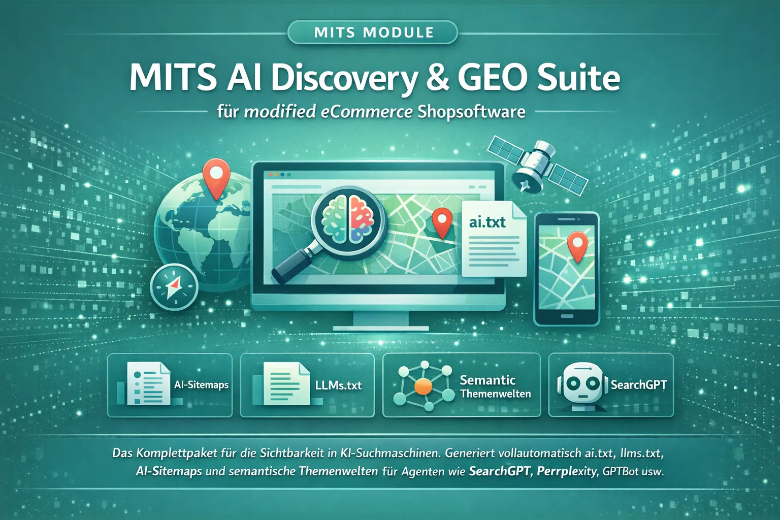 MITS AI Discovery & GEO Suite erweitert die modified eCommerce Shopsoftware um eine professionelle AI-Discovery-Schicht für moderne KI-Crawler, AI-Suchmaschinen und Large Language Models. Das Modul erzeugt automatisch wichtige Dateien wie